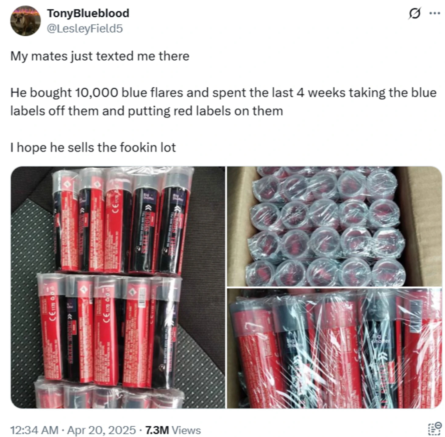 «Мне только что написал мой кореш. Он купил 10 000 синих сигнальных ракет и потратил последние четыре недели на то, чтобы снять с них синие этикетки и наклеить красные. Надеюсь, он продаст чертовски много».