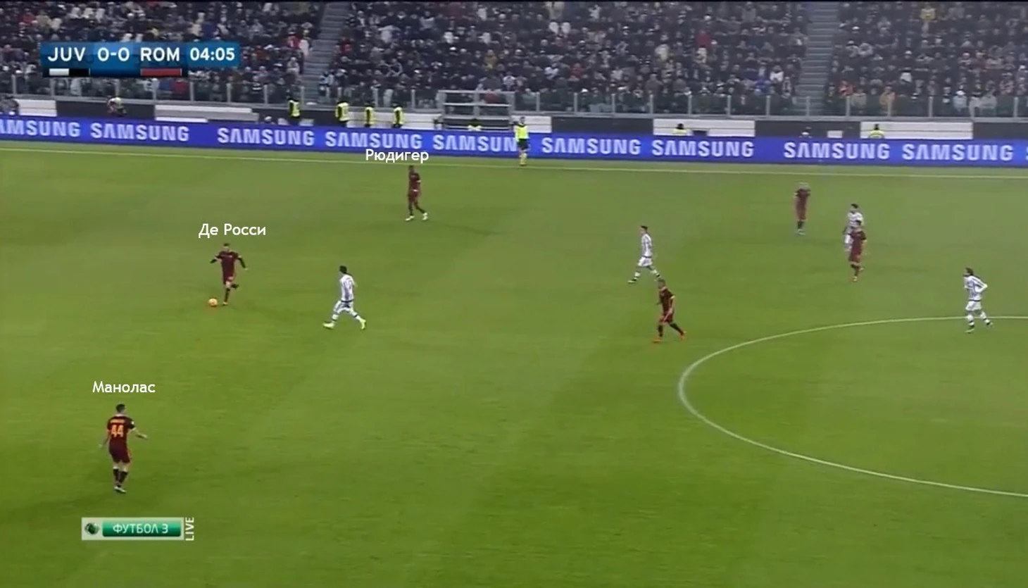 Спаллетти с первых игр начал проявлять тактическую гибкость. Уже во второй игре, которая выпала на «Юве», «джиалоросси» начали с тройкой цз в обороне. Римляне играли глубоким вторым номером. Де Росси начинал атаки последним защитником, его плечами в обороне были Манолас и Рюдигер.