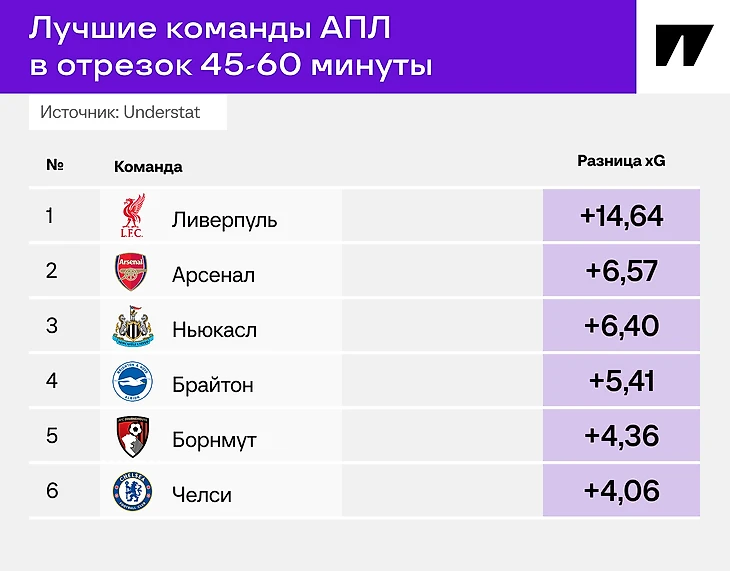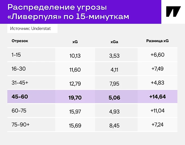 Вот таблица с распределением угрозы, которую создает и допускает «Ливерпуль» по 15-минуткам. Отрезок сразу после перерыва – самый страшный для соперников:
