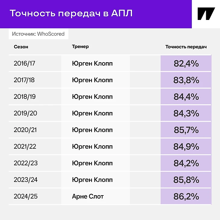 Косвенным индикатором служит точность передач. Движение в сторону улучшения контроля началось еще при Клоппе – мы много писали про взаимное влияние Пепа и Юргена друг на друга. Именно Клопп собрал чемпионскую полузащиту, которая сильно отличалась от ранних версий его команд. Слот продолжил эту работу и вывел управление ритмом на новый уровень.