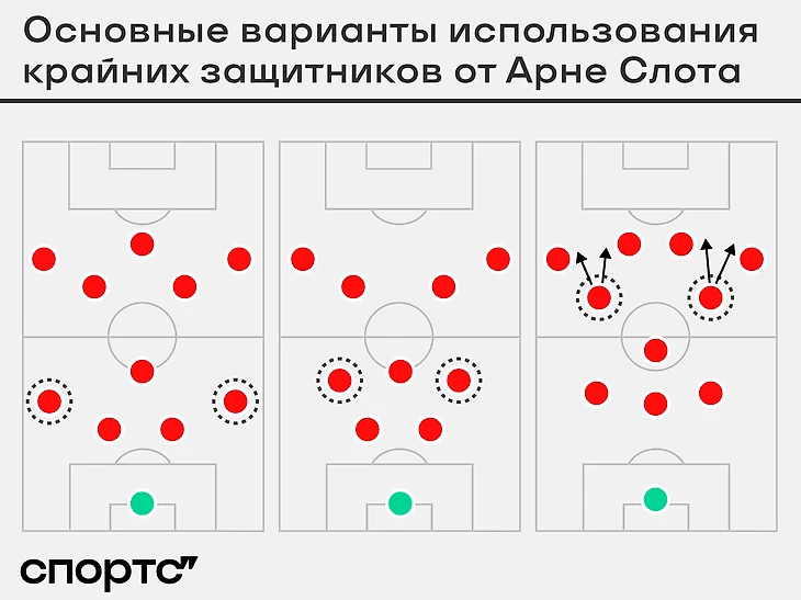 Самый частый тактический прием – изменение расположение крайних защитников так, чтобы было максимально неудобно сопернику. Латерали = инструменты влияния Слота. Чтобы играть у него на этой позиции, надо быть максимально вариативным. Арне читает соперника и адаптирует их расположение.