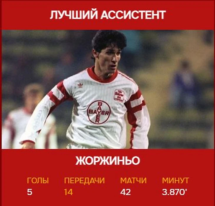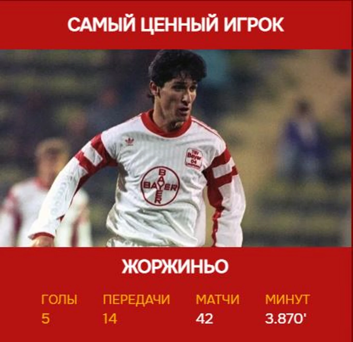 В Леверкузене Жоржиньо контролировал правую бровку в схеме 3-5-2 на протяжении трех сезонов — с 1989/90 по 1991/92. Играл здорово. Даже круто. После скромных 2+3 в 21 матче в дебютном сезоне, Жорже по полной раскрылся как созидатель и два сезона подряд становился лучшим ассистентом «аспириновых»