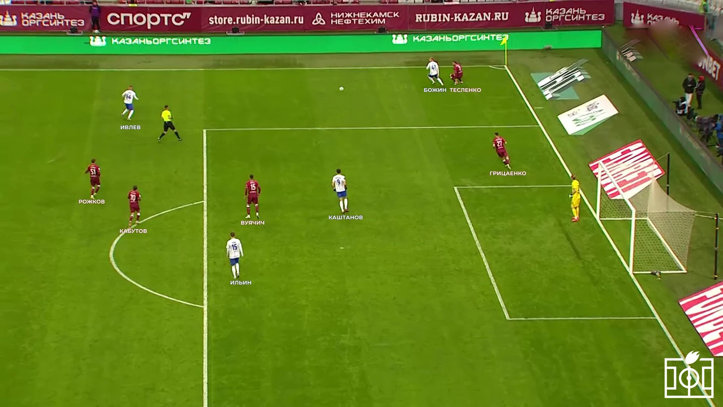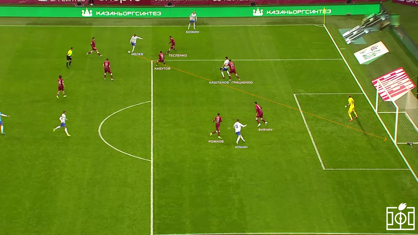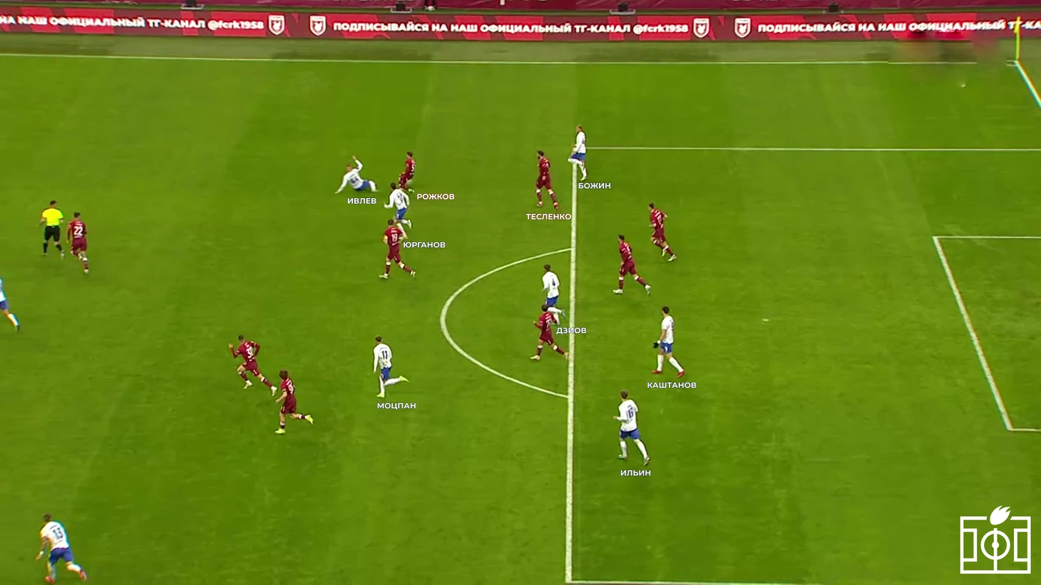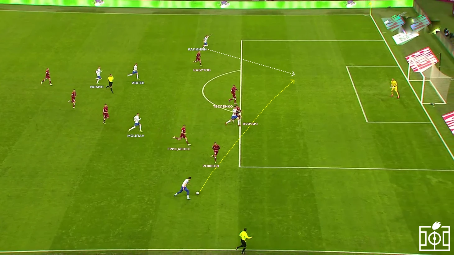 После перехваченного Кабутовым навеса Калинина — мяч оказался на фланге, где Ильин сразу включился в прессинг против Васильева. Это заставило молодого полузащитника ошибиться при передаче, в результате чего мяч вернулся к Калинину.