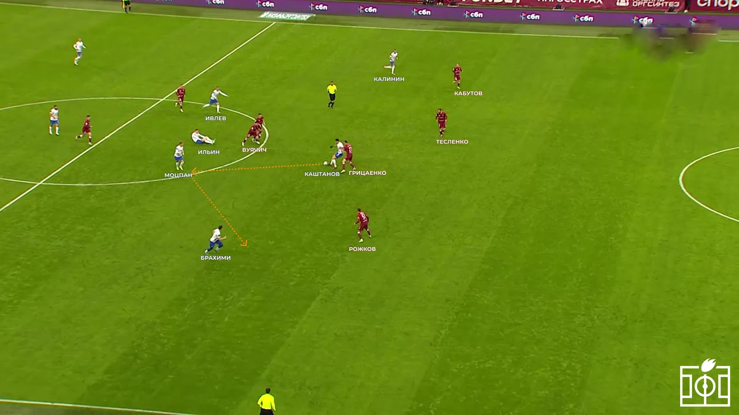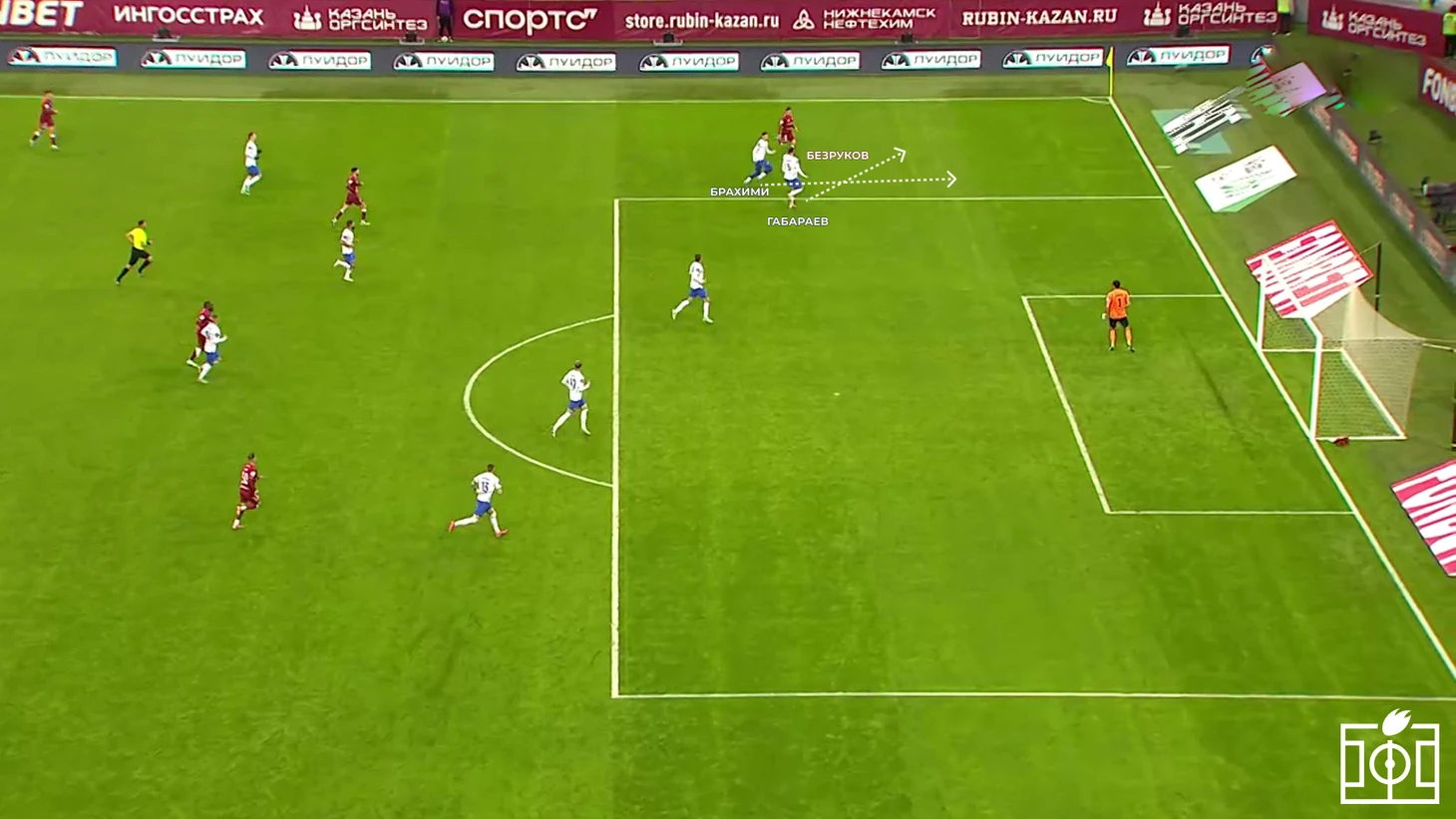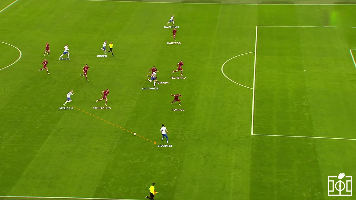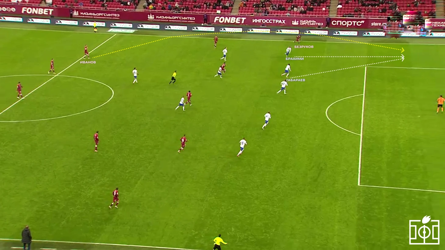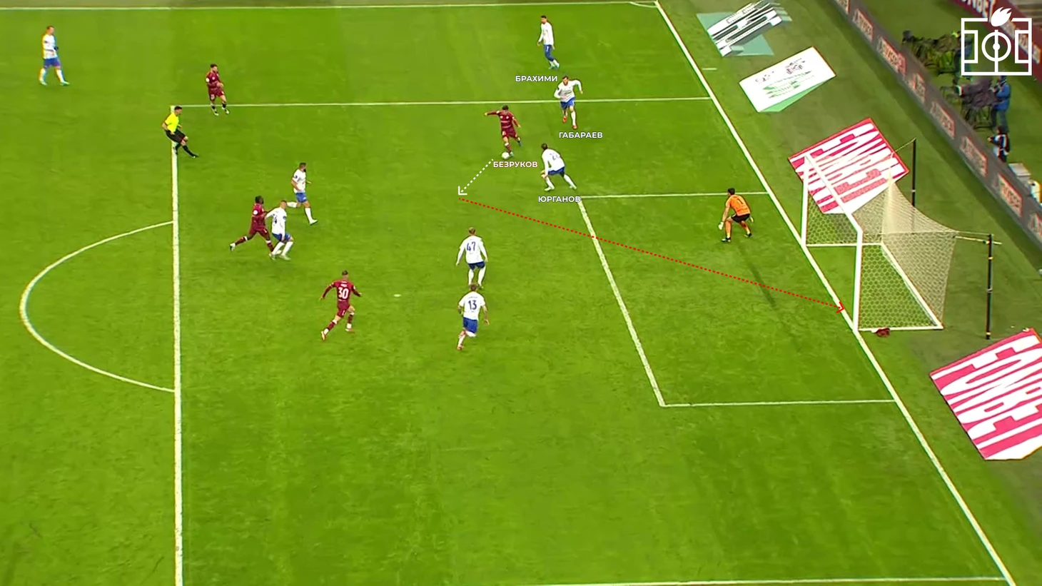 Иванов выполняет длинную передачу в направлении Руслана Безрукова. Пуси не пытается помешать быстрому розыгрышу, а Габараев остаётся в полупозиции, не замечая забежавшего на левом фланге Безрукова.