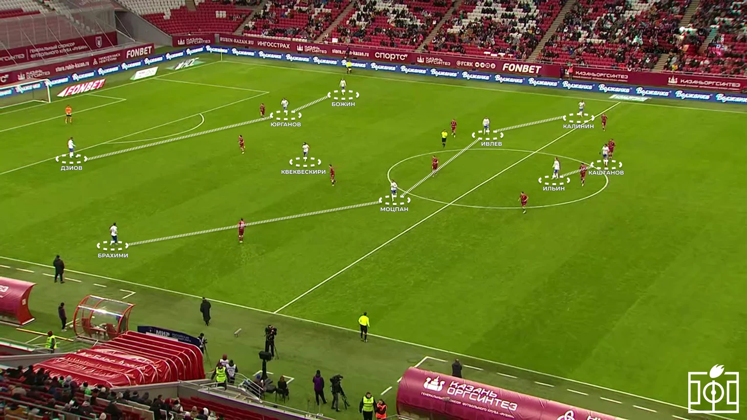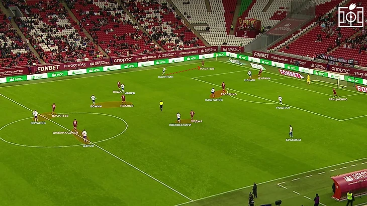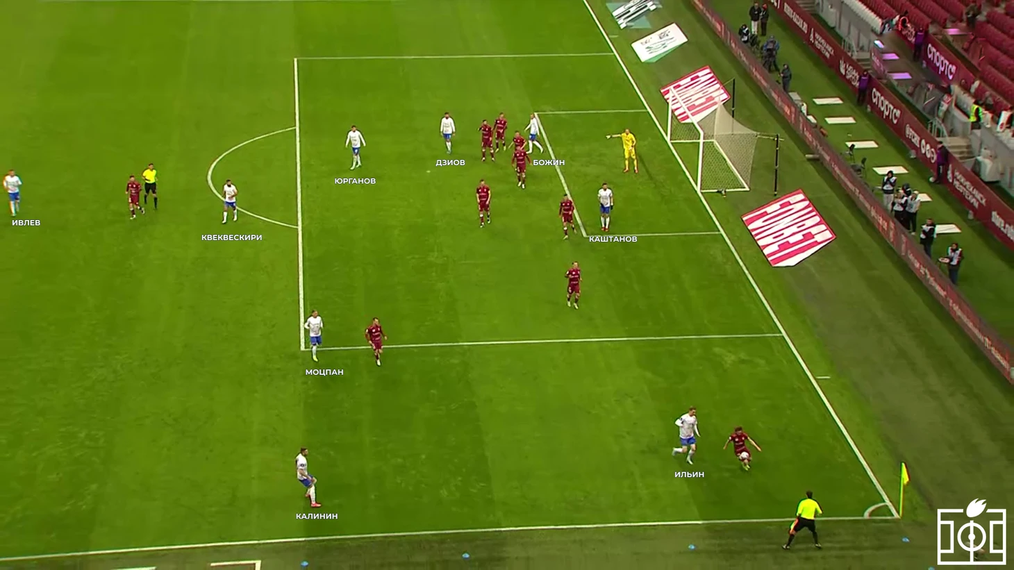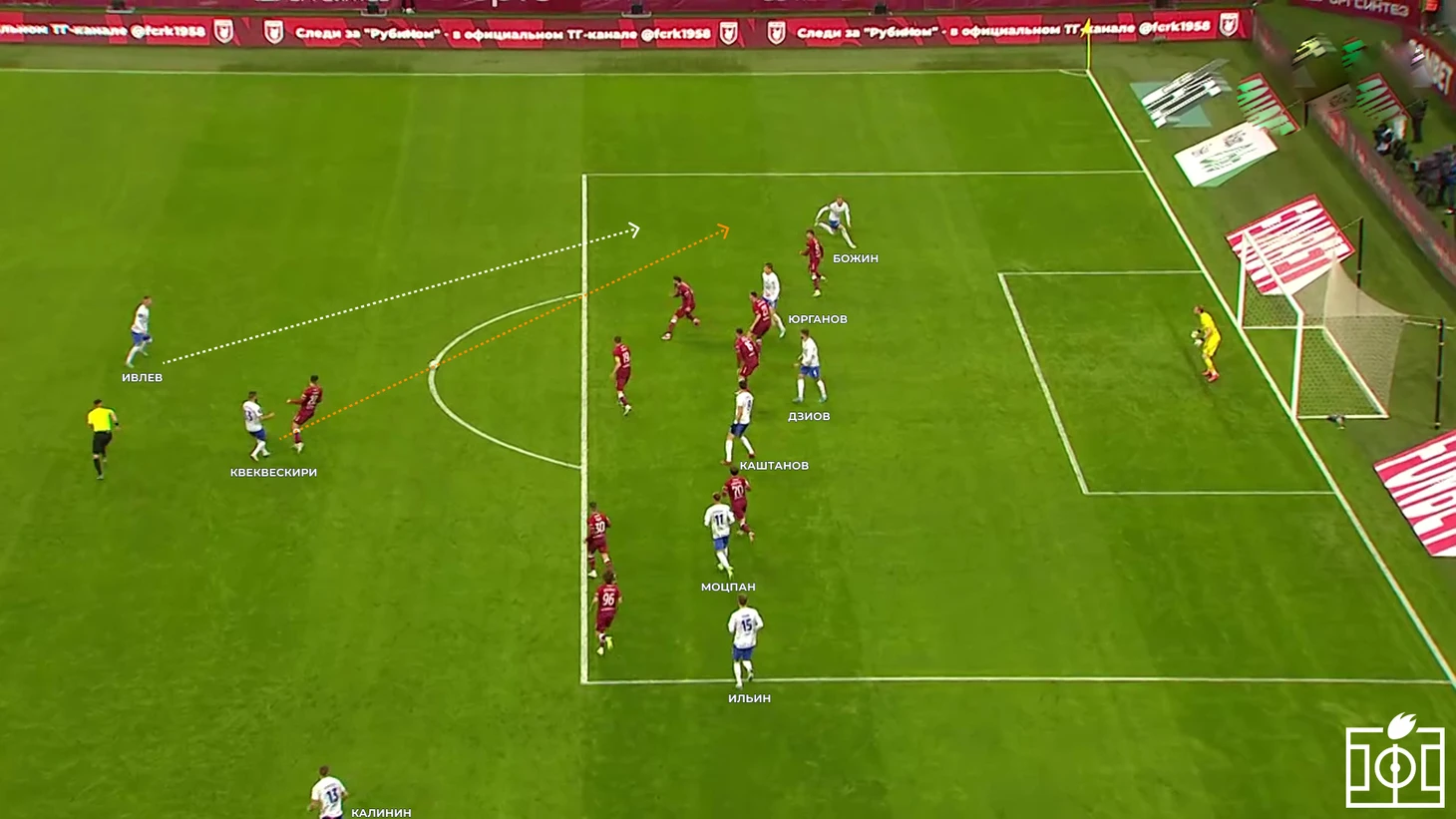 Калинин отдает мяч Моцпану, который в свою очередь делает передачу на Квеквескири. Капитан ошибается в передаче на Божина. Ивлев начинает движение в финальную треть.