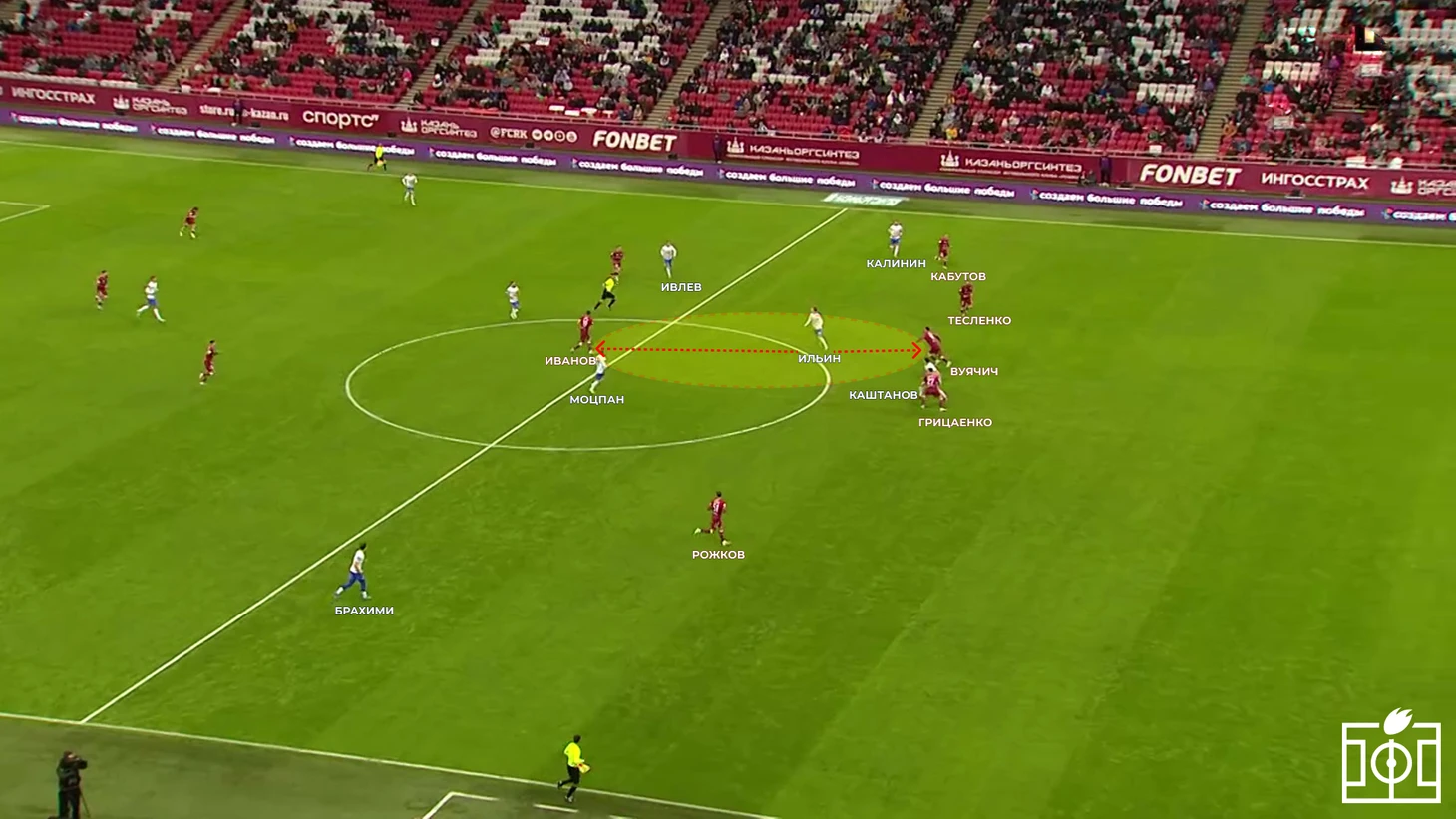 При получении мяча одним из центральных защитников «Рубина» в прессинг сразу включался Владимир Ильин, активно выдвигаясь на мяч. Одновременно с этим Никита Моцпан контролировал зону второго центрального защитника, а Алексей Каштанов играл по Тесленко, который часто поднимался в опорную зону при розыгрыше.