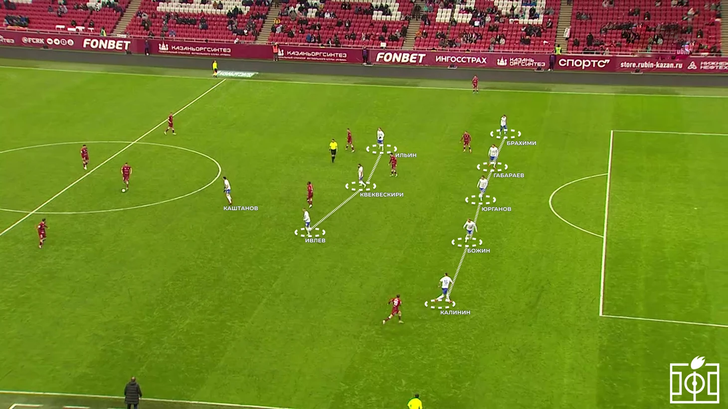 Состоятельность стартового плана Игоря Шалимова была подтверждена не только забитым голом, но и заменой главным тренером «Рубина» Никиты Васильева на Угочукву Иву уже на 40-й минуте матча. Вероятно за счет этой замены Рахимов стремился минимизировать потери мяча в центре поля и усилить позиционную атаку команды за счет более грамотного владения — Угочукву Иву в топ-3 среди игроков «Рубина» по показателю xGBuildup — 2.93