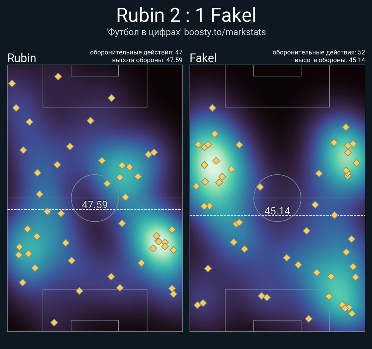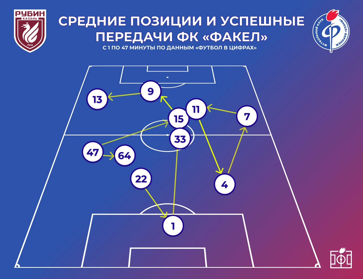 Такая структура прессинга позволяла «Факелу» эффективно контролировать игроков «Рубина» по всей ширине поля, серьёзно затрудняя сопернику организацию начала атак.