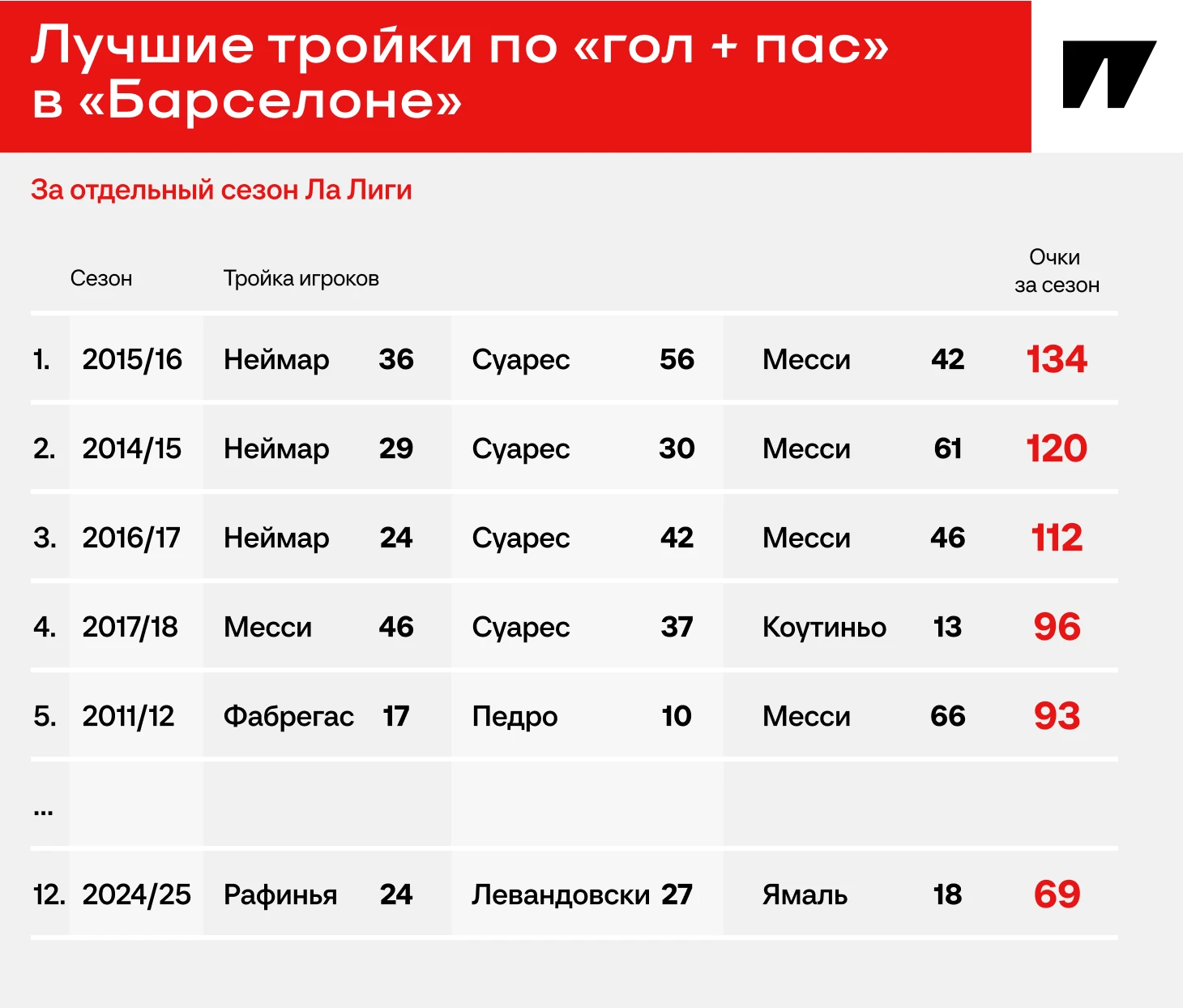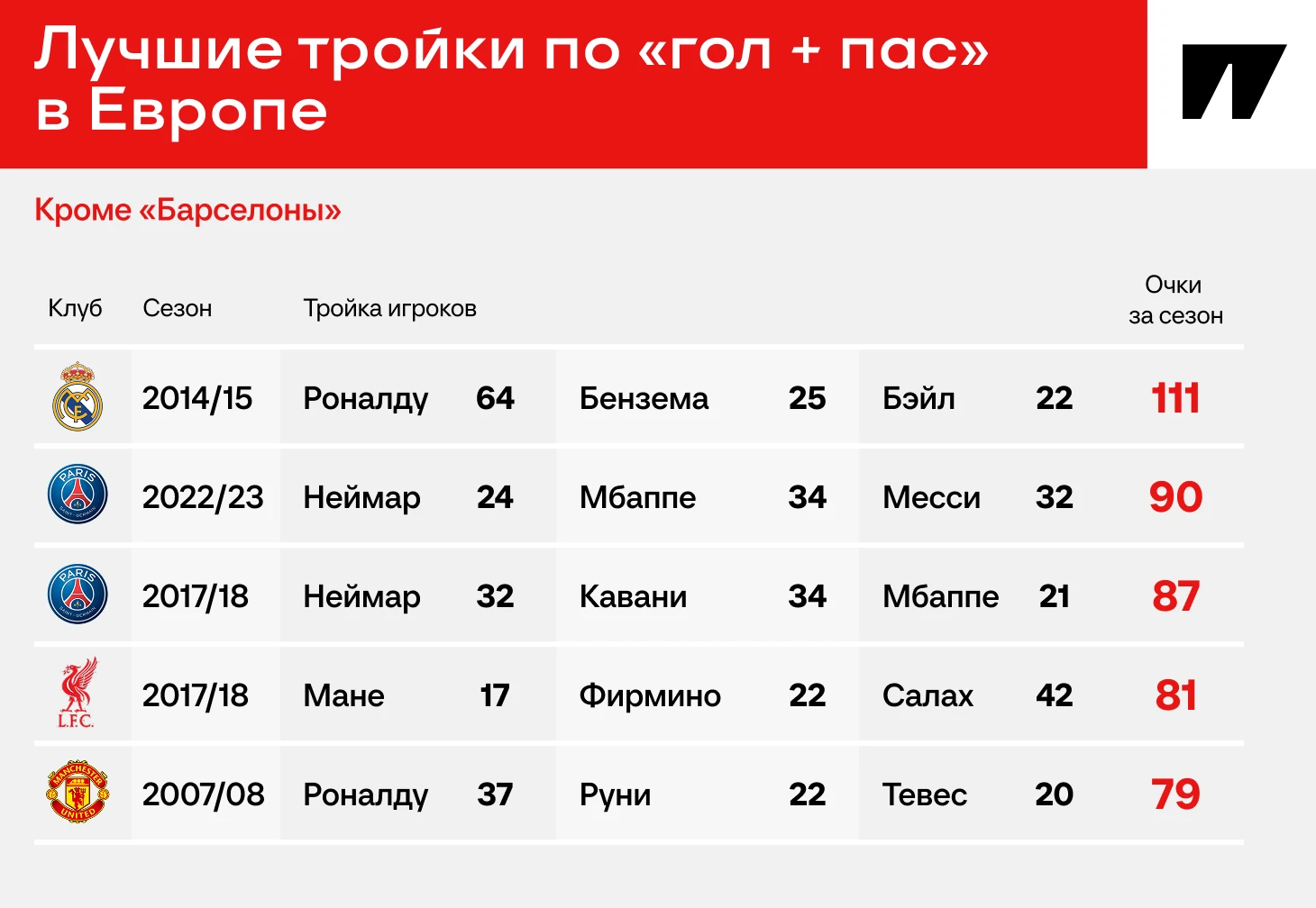 ● Но 69 очков по гол+пас на троих – пока даже не в топ-10 в современной истории клуба. Тут, конечно, выделяется легендарное трио МСН: они с отрывом забрали первые три места, выбивая каждый раз больше 100 очков. Один только Месси несколько раз набирал больше 60 очков – примерно как нынешняя тройка нападения вместе взятая.