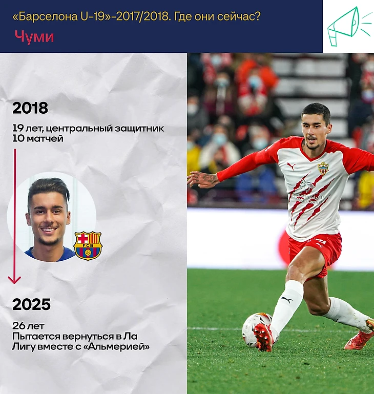 Дальнейшая карьера: в главной команде ограничился 238 минутами в Кубке Испании-18/19. Следующий сезон стал для Чуми последним в системе «Барсы», в нем он однажды появился на скамейке в матче Ла Лиги и периодически выходил за вторую команду. Далее случился переход в «Альмерию».