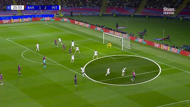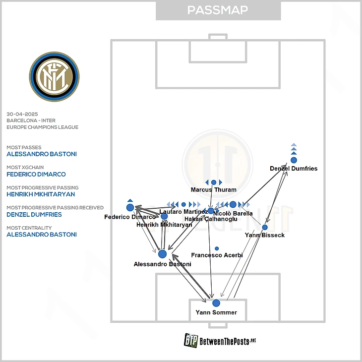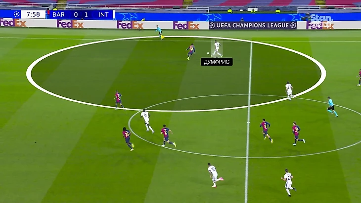 Индзаги не испугался прессинга «Барсы». «Интер» начинал атаки в короткий пас и контролируемо доводил мяч до Думфриса, что значительно завышало остроту эпизодов с его участием. Генеральная идея отпечаталась на карте передач: изначально розыгрыши направляются в левую часть поля, а Думфрис – выше всех по средней позиции.
