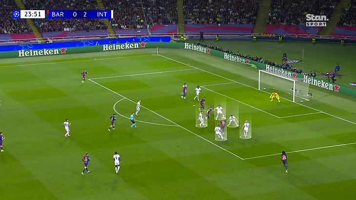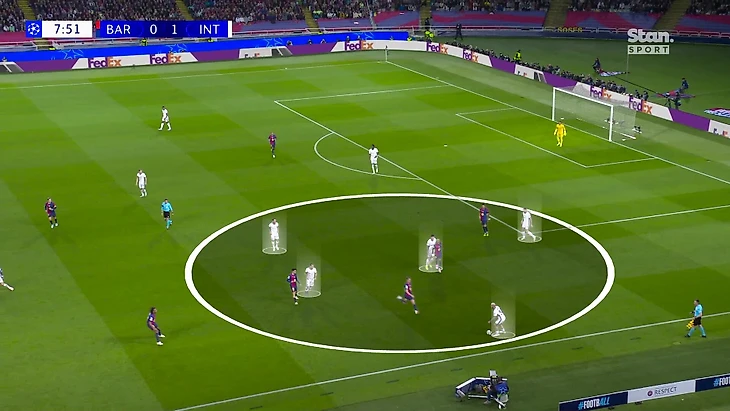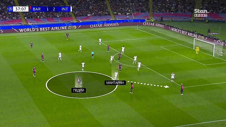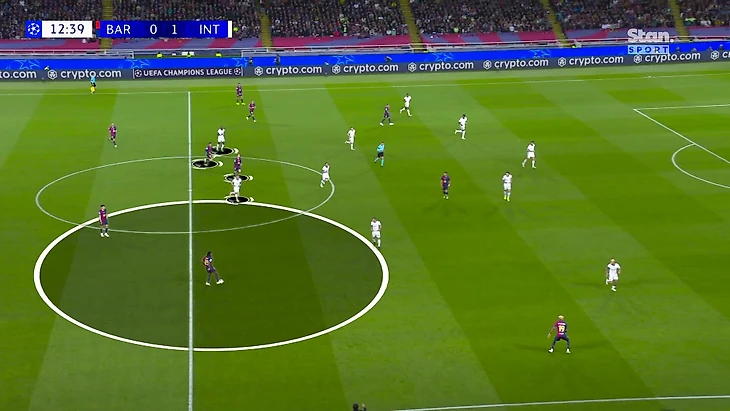 Такой расклад означал, что все источники доставки мяча должна контролировать пара нападающих – Тюрам и Лаутаро в этом рисунке должны были успевать оказывать давление на Френки, Педри, Кунде и Кубарси, каждый из которых хорошо пасует и располагался достаточно близко к Ямалю, чтобы доставлять мяч. Неравный расклад, даже с учетом смещений по мячу и чтения эпизодов.