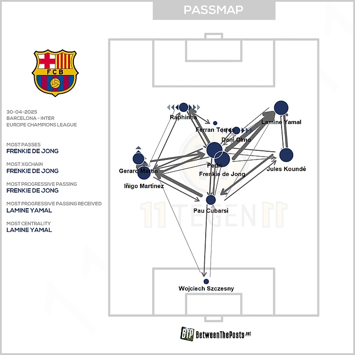 Подобное повторялось регулярно. Почти вся угроза «Барсы» с игры прямо или косвенно шла через активность Ямаля. «Интер» позволил слишком легко кормить его мячом. Предельная степень вовлеченности видна на карте передач: