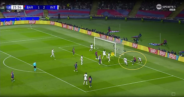 Другое важное направление – стандарты. «Интер» (и конкретно Думфрис) дважды забил с угловых. Подачи шли с разных флангов, но можно выделить несколько общих элементов.