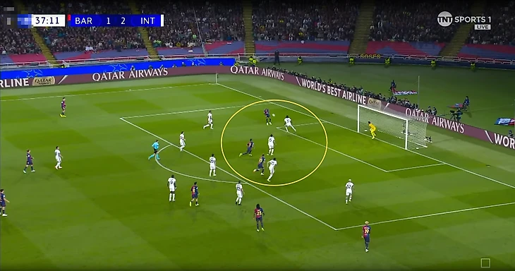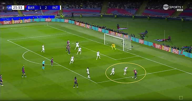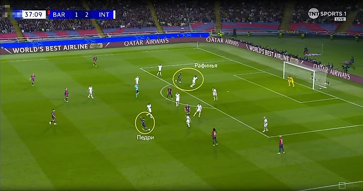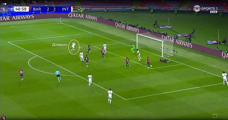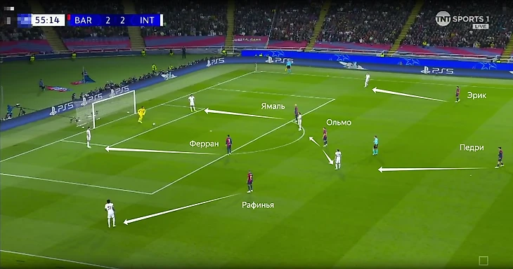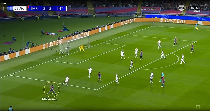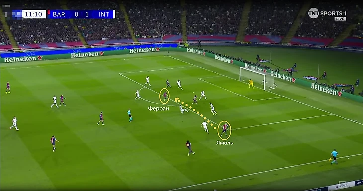 В эпизоде с первым забитым мячом «Барселоны» Ламин также сначала прошел нескольких футболистов «Интера» и самостоятельно сделал ситуацию опасной.