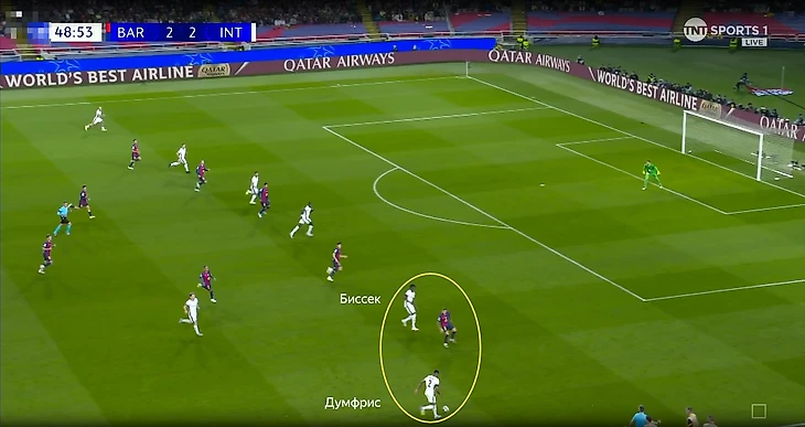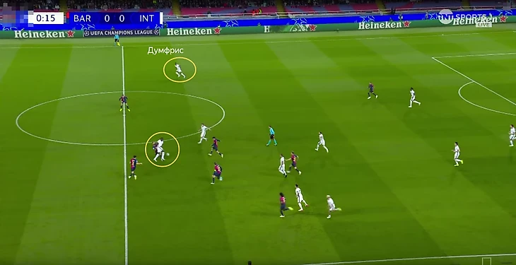 Вот показательный эпизод. Бастони (левый центральный защитник) разгоняет атаку. Затем мяч переходит на противоположный фланг. Там Думфрис (правый латераль) выводит на прострел Биссека (правый центральный защитник). А эпизод опасным ударом завершает Димарко (левый латераль).