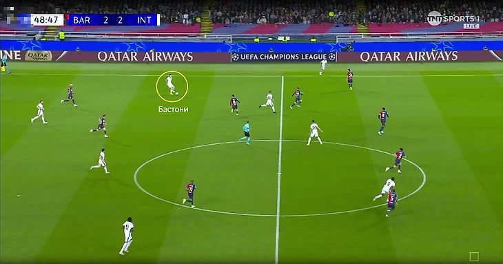 В самой концовке «Интер» вообще перешел на схему 5-4-1 (впереди оставался только один Тареми). Подобные действия помогали гостям иметь более комфортные соотношения игроков в обороне. Но зачастую чрезмерное стремление играть глубоко не помогало отодвигать игру от своих ворот.