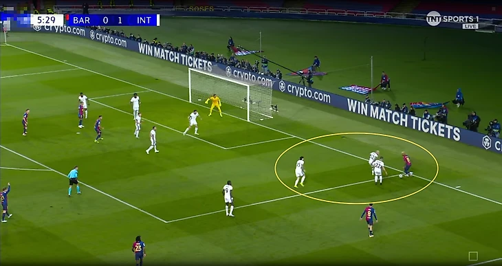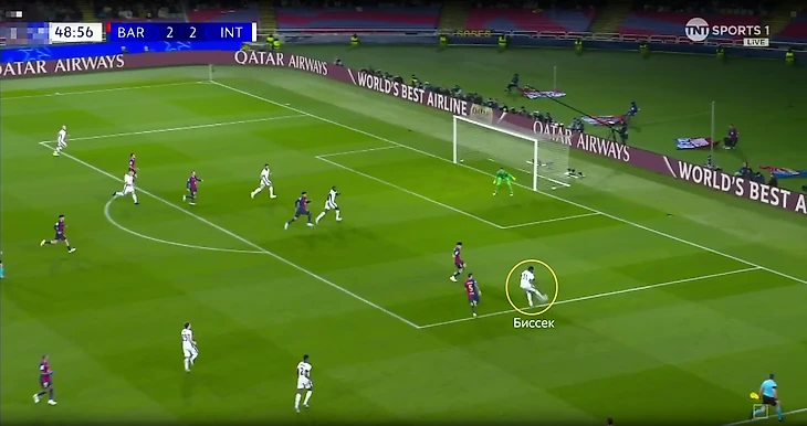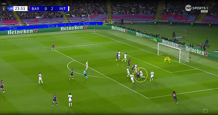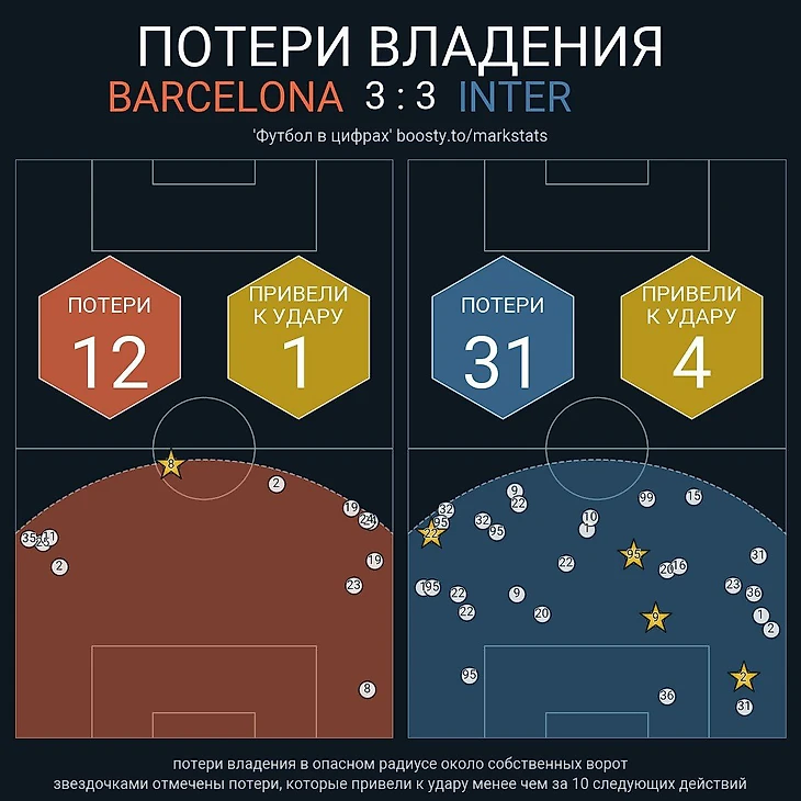 Важно отметить, что большую роль в настолько заметном территориальном доминировании хозяев сыграло не только стремление «Интера» глубоко защищаться, но и качественное высокое давление от команды Флика (PPDA = 5.2). «Барса» регулярно отбирала мячи в высоких позициях и не позволяла сопернику выходить на чужую половину поля.