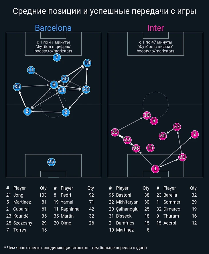 «Интер» здорово подготовился к «Барселоне»: грамотные численные соотношения на всех участках поля, подстраховка не левом фланге обороны против Ямаля, эффективные стандарты. Даже при трех пропущенных можно зафиксировать, что команда Индзаги здорово сдерживала соперника: «Барса» наиграла всего на 1.38 xG.