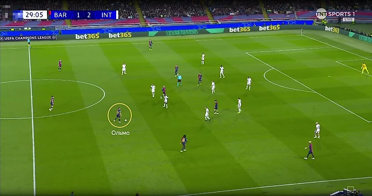 Другой важный момент – активные выдвижения защитников. Все они действовали в агрессивной (в плане выдвижений) манере: Бастони отвечал за Ольмо, Ачерби – за Феррана, Биссек – за Рафинью. Латерали при необходимости выдвигались по фангам.
