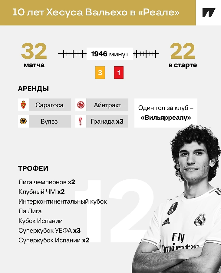 Единственный гол Хесуса за «Реал» случился в 2019 году, когда в 36-м туре он забил «Вильярреалу». Всего за карьеру Вальехо забил три гола: еще по разу отличился в родной «Сарагосе» и за «Айнтрахт».