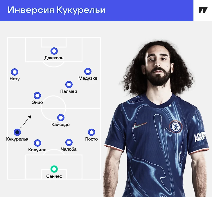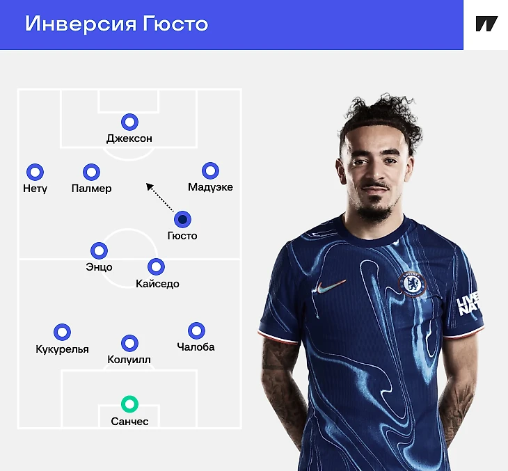 В «Челси» Мареска чередовал инверсии между флангами: в центр смещался то Мало Гюсто, то Кукурелья. Тренер через несколько месяцев доработал идею ради атакующего потенциала: Гюсто поднимался не в опорную зону, а гораздо выше, на позицию десятки в правом полуфланге. Левый занимал Коул Палмер, Энцо Фернандес оказывался без позиции.