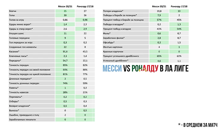 Итого в свой последний сезон Роналду оформил 44+8 в 44 матчах, а Месси 38+14 в 47. У обоих 52 голевых действия, фантастические цифры от фантастических футболистов, а ведь это даже не пик их формы. После этого Лео бесплатно перейдёт в «ПСЖ», а Криштиану в «Ювентус» за 117 миллионов евро. Они не просто вписали своё имя в историю клубов, они перевернули весь футбол: после «сливочного» Криша и «сине-гранатового» Месси даже 40 голевых действий за сезон считается средним результатом, что прекрасно говорит об их величии и влиянии на футбол. Удивительно ведь, как так совпали звёзды, что эти два монстра появились и играли в одно время, и как их сравнивать, когда один машина для забивания красивых и важных голов, а другой умеет буквально всё на поле. В целом сравнить эту парочку невозможно, поэтому мы и рассматриваем отдельно взятые сезоны.