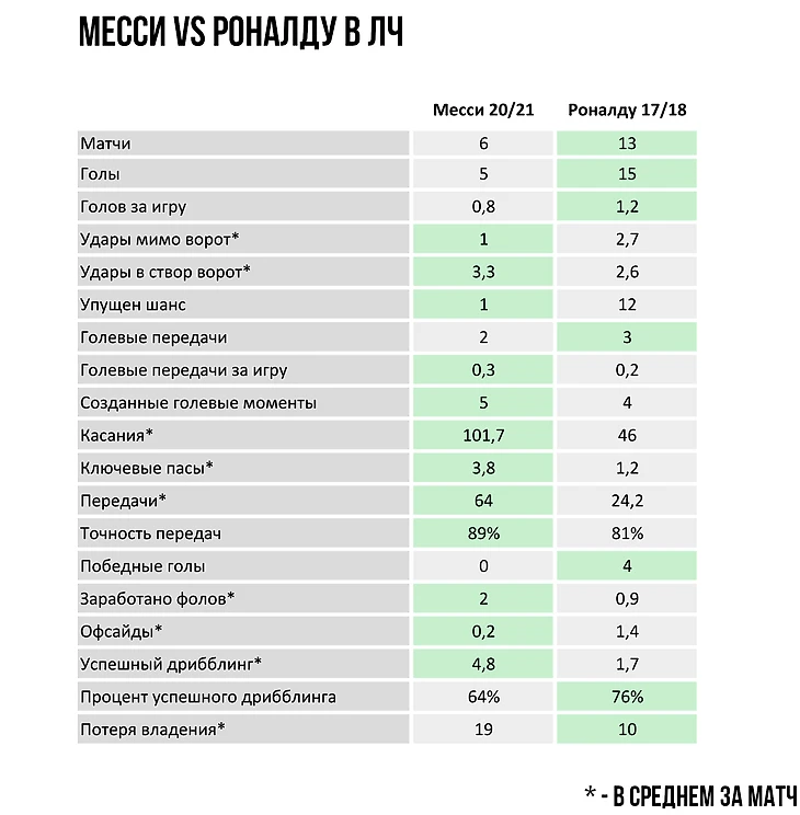 Месси и Роналду — величайшие в истории футбола, для кого-то это так. Другие же считают, что величайшим может быть только один. Ну, если это действительно так, то кто же — Месси или Роналду? Если мы будем сравнивать всю их карьеру, то этот пост может стать самым длинным в истории Sports.ru, чего нам, конечно же, не надо, поэтому сегодня мы сравним их заключительные сезоны в лучших клубах мира: Месси в «Барселоне», Роналду в «Реал Мадриде». В случае Месси это сезон 20/21, а с Роналду 17/18, кстати, возраст обоих в момент ухода из клуба был приблизительно одинаковым, Лионелю было 34, Криштиану 33, условия, можно сказать равны, если не брать во внимание тот факт, что Месси ушёл из, по мнению многих, кризисной «Барсы», а Роналду из весьма солидного «Реала», который смог выиграть ЛЧ спустя всего 4 года после его ухода. Не будем тратить время, переходим к сравнению…