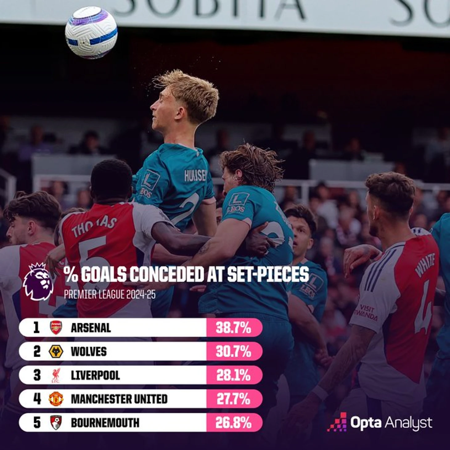 По данным Opta, «канониры» пропустили 38,7% голов (12 из 31) после стандартных положений. Это первое место в АПЛ. Причем в сегодняшнем проигранном матче с «Борнмутом» команда Артеты пропустила два таких мяча − после углового и аута.