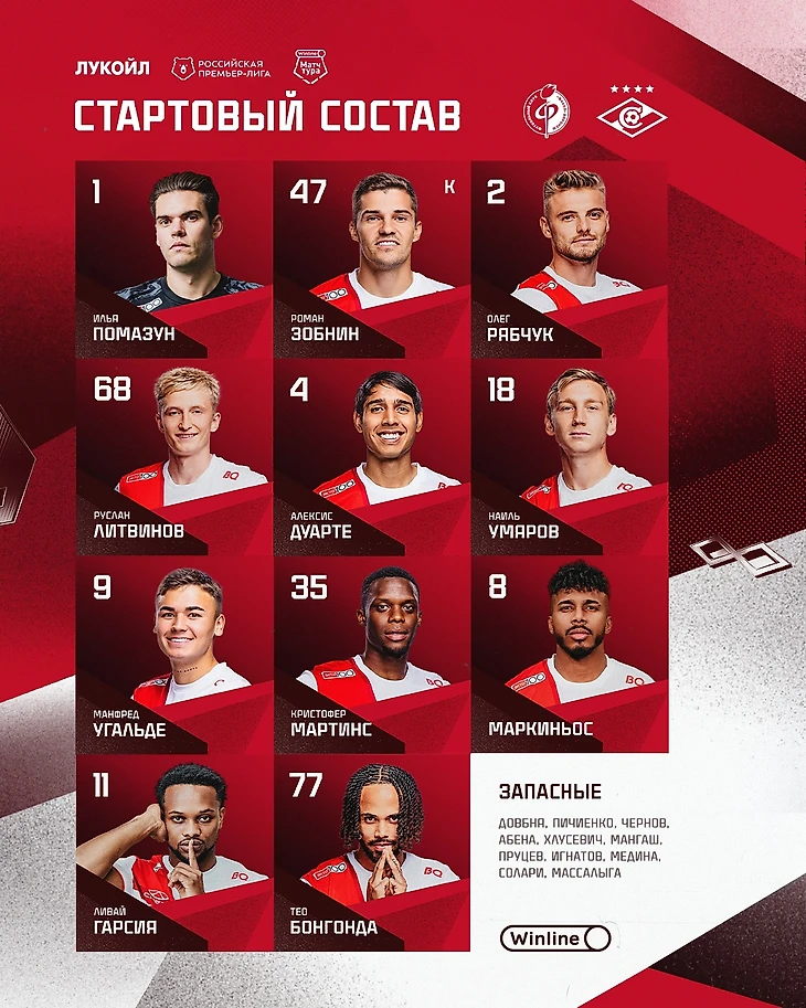 «Спартак»: Помазун, Зобнин (к), Рябчук, Литвинов, Дуарте, Умяров, Угальде, Мартинс, Маркиньос, Гарсия, Бонгонда.