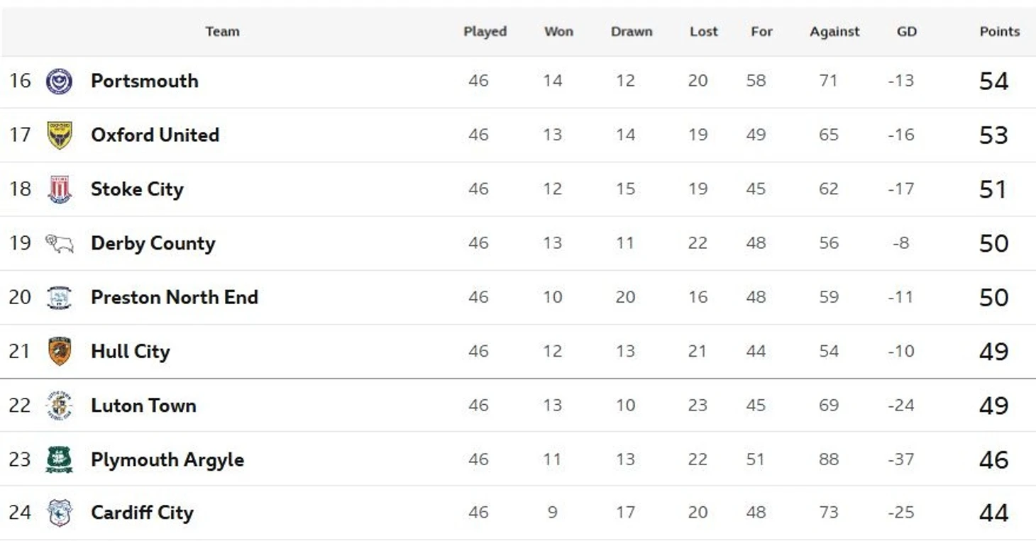 Интересный факт – из лиги не вылетел ни один из новичков («Дерби Каунти», «Оксфорд», Портсмут») – полная противоположность АПЛ, где тройка дебютантов отправляется обратно второй год подряд.