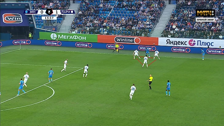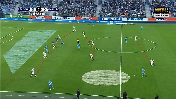 Если левый фланг у Зенита более комбинационный в целом после возобновления сезона, то вот правый более прямолинейный. Тут играет самый мощный дуэт лиги Мантуан и Луис Энрике, которые оба могут обыграть 1в1, войти в штрафную или прострелить/навесить. Таким образом Зенит создал несколько явных голевых моментов, в том числе первый забитый мяч и ещё 3 упущенных шанса Соболева. (см. фото ниже)