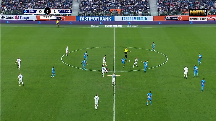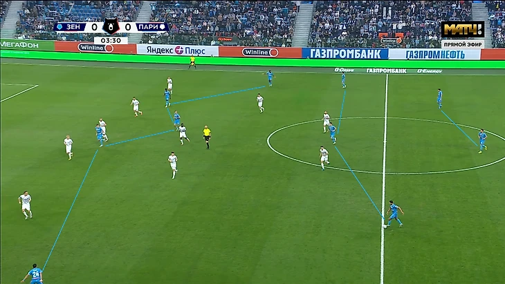 Без мяча же типичные по сезону 4-4-2, с первой линией Соболев-Глушенков. Но владения соперника Зенит всё же пытался накрывать на чужой половине 1в1, пусть это был и не агрессивный прессинг и владений этих было очень мало.