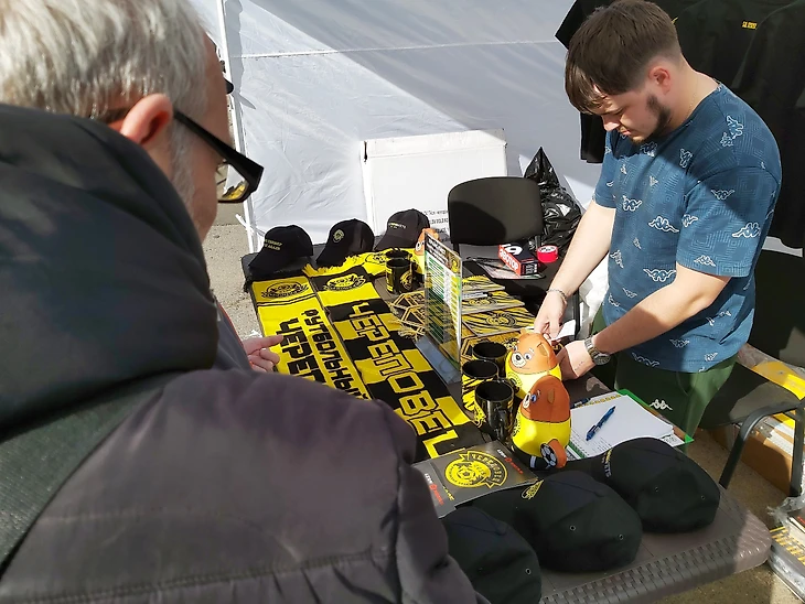 В палатке с атрибутикой нахожу много всякой всячины. Есть даже мягкие игрушки. Цены не то чтобы кусаются, подходящие болельщики активно изучают ассортимент. Я же беру только предматчевую программку. Шарфы я как-то не коллекционирую, кепки тоже, а вот игровых футболок, к сожалению, в продаже не было. Видать, всё ушло игрокам.