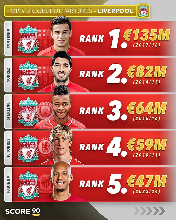 🤑 Крупнейшие продажи большой шестерки АПЛ. Самый выгодный трансфер у «Ливерпуля», «Арсенал» может удивить