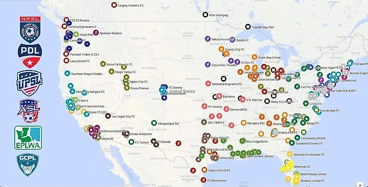 В США — десятки уровней: от профессиональной MLS до университетских чемпионатов, полупрофессиональных структур и клубов, существующих только на бумаге. Такая система кажется идеальной: хочешь играть — выбирай свою ступень и поднимайся.