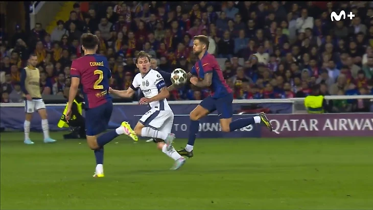 После руки Мартинеса «Барселона» сначала отобрала мяч, но затем потеряла его снова — и «Интер» молниеносно организовал переход, который вновь вывел Дюмфриса в штрафную соперника. Его передача на Тареми в центр была перехвачена в подкате Араухо. Мяч ушел на угловой — и именно после этого углового случился третий гол «Интера».
