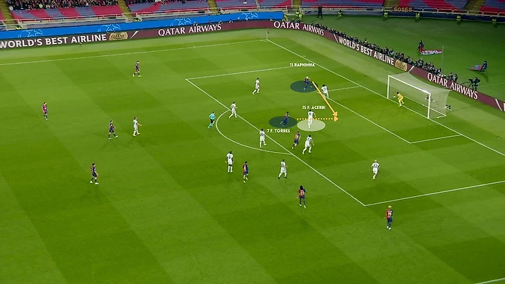Ситуация еще больше усугубилась, когда «Барселона» сравняла счет, и — что любопытно — этот гол стал редким моментом, в котором не участвовал Ямаль. Все началось с длинного перевода Педри на Рафинью в штрафную. Бразилец обманул Биссека, ставшего в этом эпизоде просто зрителем — а Ферран Торрес совершил рывок за спину сфокусировавшего на мяче Ачерби.