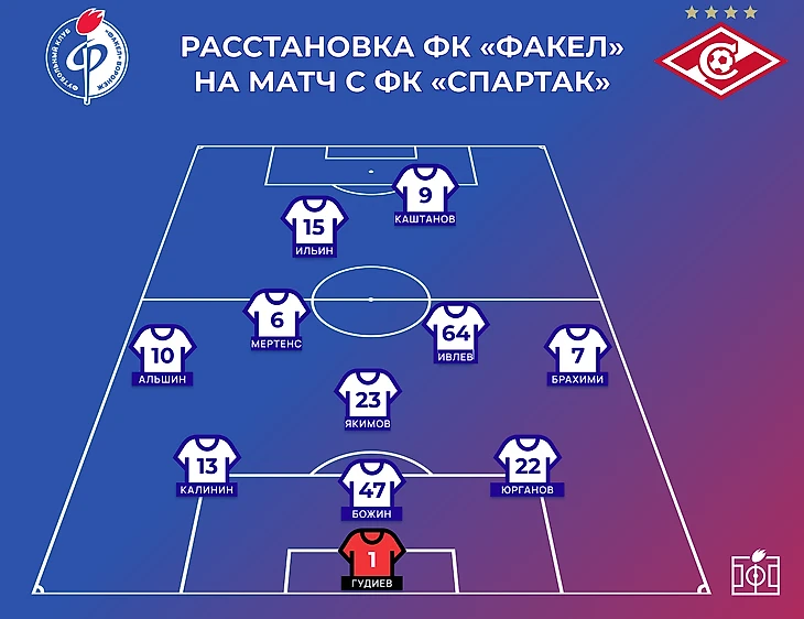 Эта модель розыгрыша вынуждала игроков «Факела» поднимать линию обороны и активнее включаться в прессинг, тем самым освобождая пространство в центре поля для смещений игроков «Спартака» и открывая зоны для рывков вингеров за спины защитников «Факела».