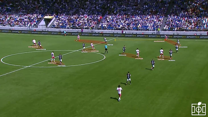 Ильин действует по Умярову, Мертенс контролирует Мартинса, а Якимов плотно играет против Угальде, открывающегося между линиями.