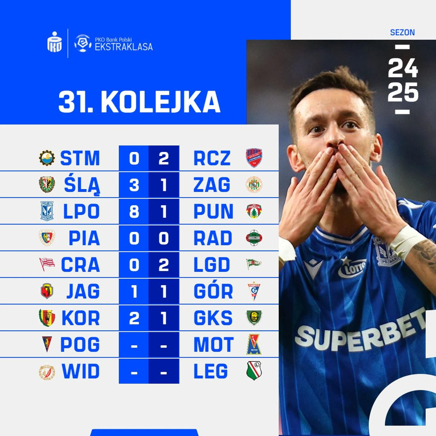 Из-за финального матча Кубка Польши в прошедший уикенд в рамках Экстракласы прошло лишь семь матчей, но и в этих семи матчах было много интересного - «Лех» разгромил «Пущу» с неприличным счетом, во Вроцлаве тридцать тысяч болельщиков наблюдали за Нижнесилезским дерби, а «Ягеллония» снова упустила победу и теперь может упустить медали.