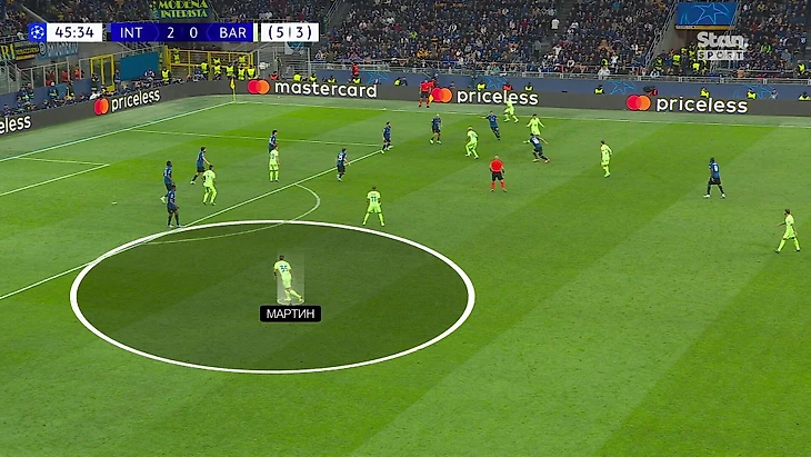 Эти изменения подводят нас к главному сюрпризу встречи – ассистам Жерара Мартина. Он мог чаще идти вперед из-за пассивности «Интера» и чаще получал мяч из-за смены акцентов в атаке «Барсы». Вместе с мячом Мартин нередко получал гектар пространства и пару минут на поиск решения: