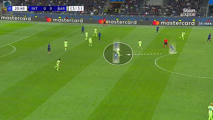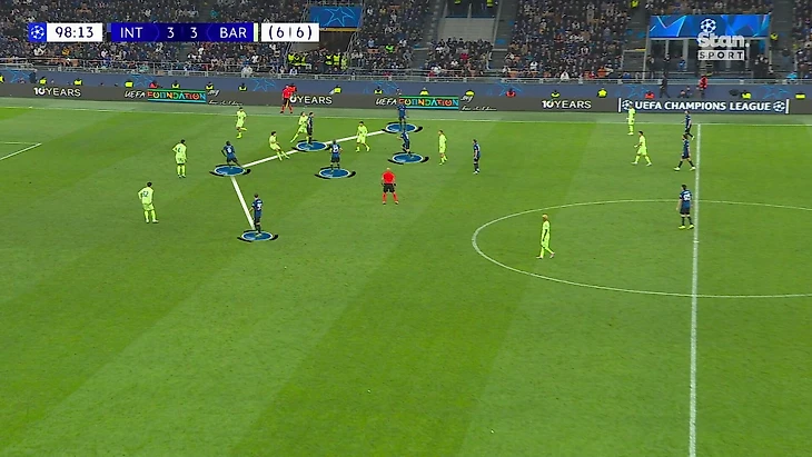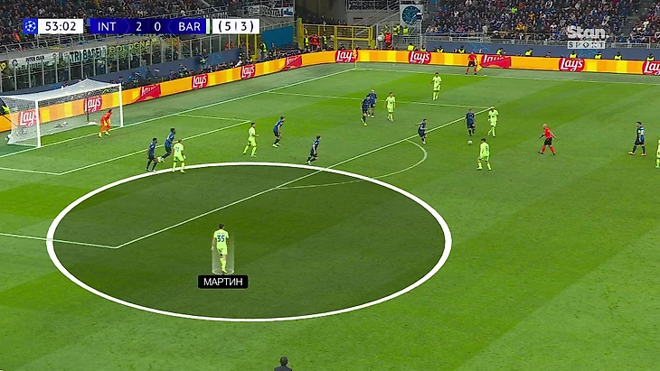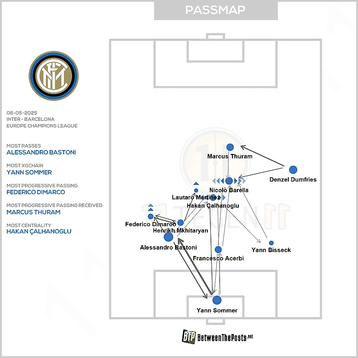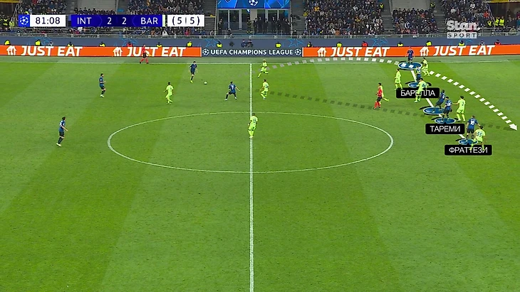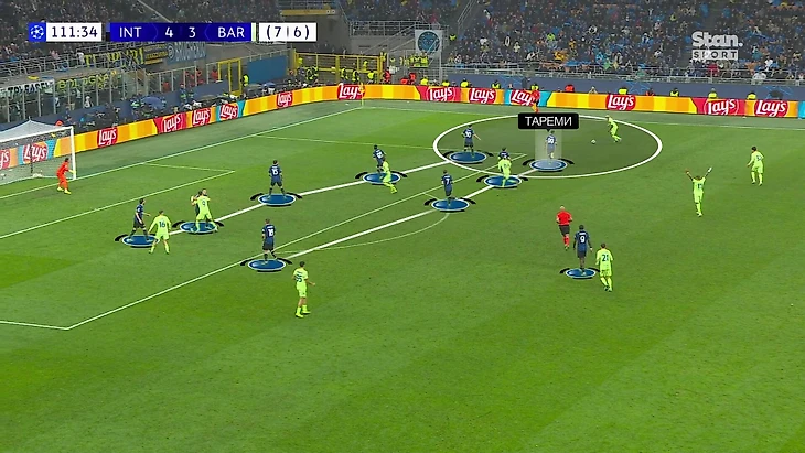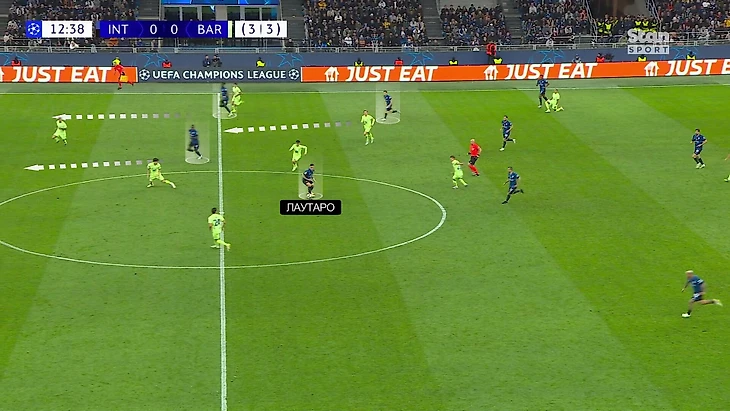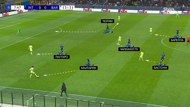 Игроки весьма четко разбивались на связующих и проверяющих линию «Барсы» рывками. Связующими чаще всего были Лаутаро и Мхитарян. Проверяющими – Тюрам, Барелла, Думфрис и Лаутаро (если Мхитарян делал всю работу связующего).