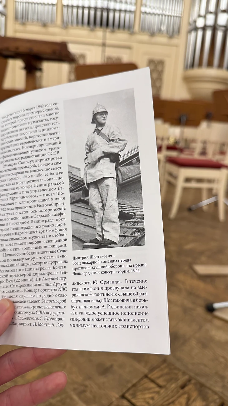 В первые месяцы войны Дмитрий Шостакович находился в Ленинграде. Он работал профессором в Консерватории, служил в добровольной пожарной дружине — тушил зажигательные бомбы на крыше Консерватории. Во время дежурств Шостакович писал одну из самых известных своих симфоний — Ленинградскую.