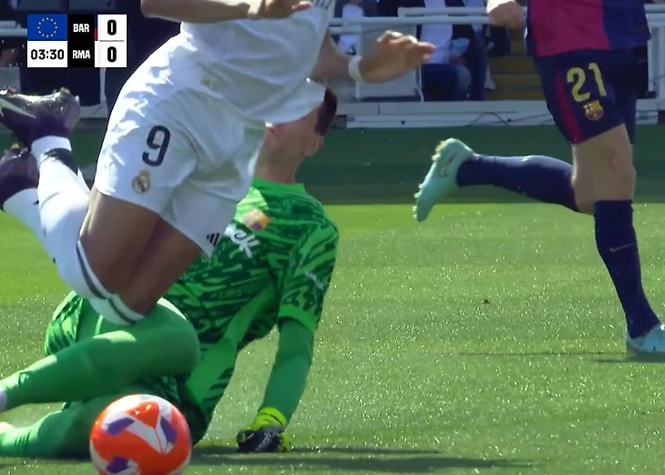 «Барса» еще рассчитывала на пенальти, когда мяч попал в руку Тчуамени. Алехандро Эрнандеса даже позвали к монитору, но главный остался при своем: это не пенальти.