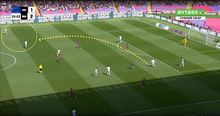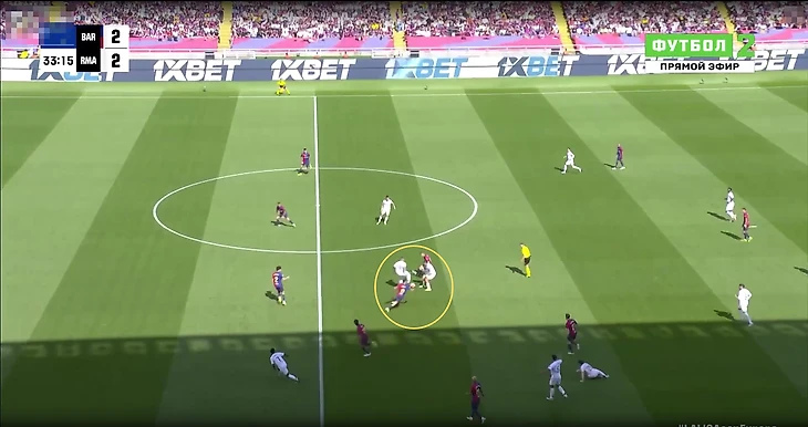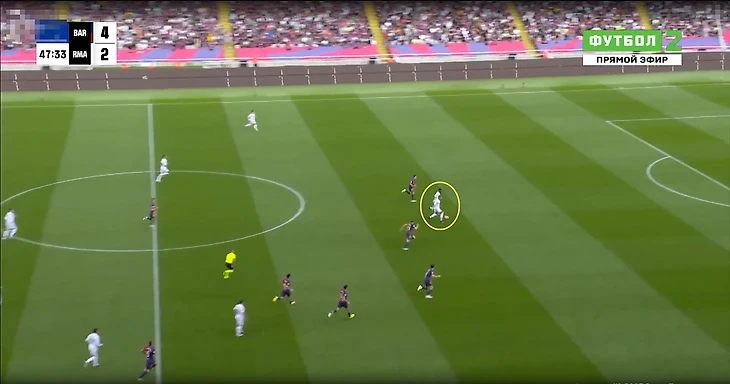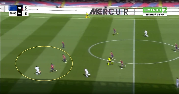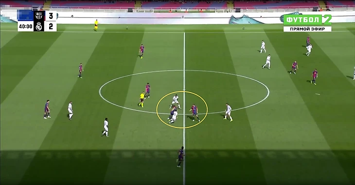 Преодоление прессинга в целом зачастую становится сильной стороной команды Анчелотти за счет умения многих игроков действовать под давлением. Против «Барсы» периодически гости тоже пытались после выхода в свободную зону сразу искать передачей своих атакующих игроков впереди.
