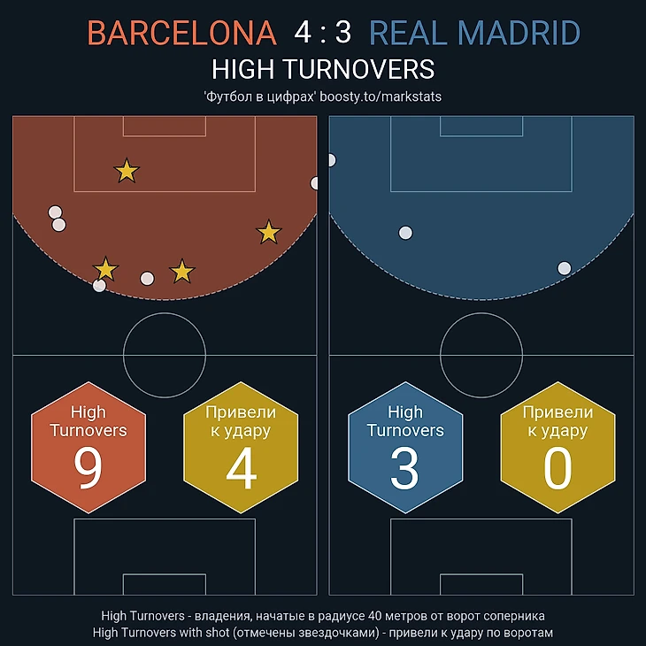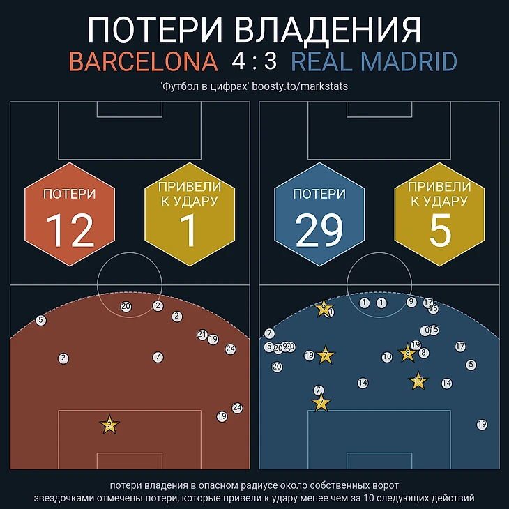 «Барселона» имела большое преимущество как по контролю мяча (61.7%), так и по контролю территории (наклон поля – 84.8%). В таком сценарии многое зависело от оборонительных действий «Реала».