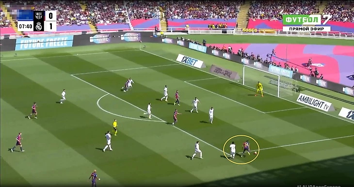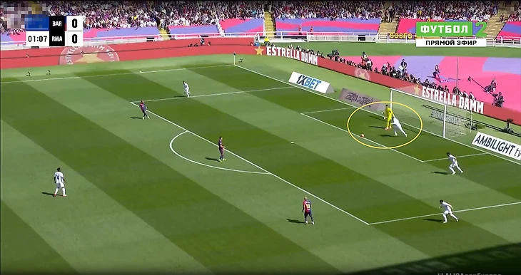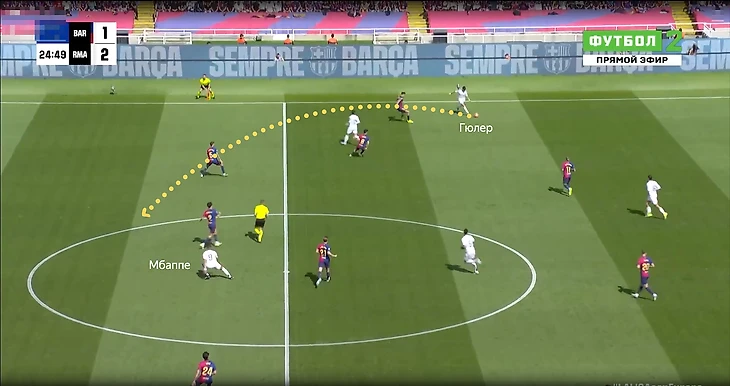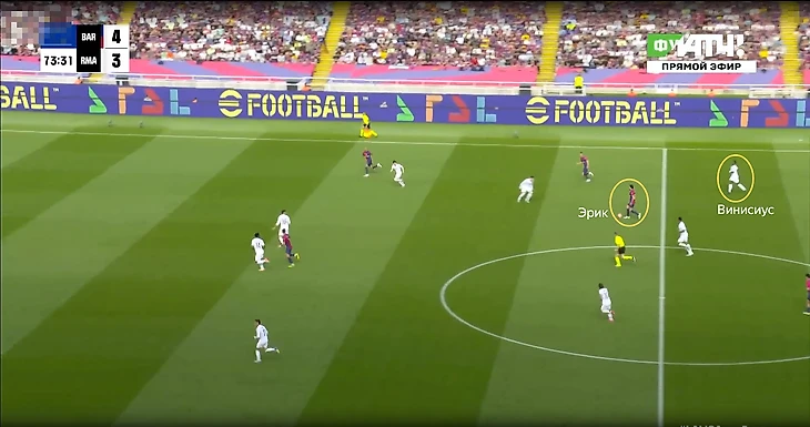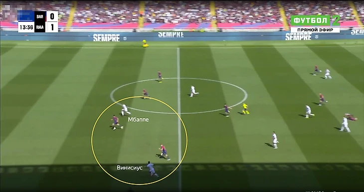 В игровом рисунке, где «Мадрид» действовал преимущественно без мяча, многое сводилось к шансам команды в контратаках. Основное направление очевидно – правый фланг обороны «Барселоны»: эта основная зона Мбаппе и Винисуса, плюс здесь у «Барсы» был Эрик Гарсия.