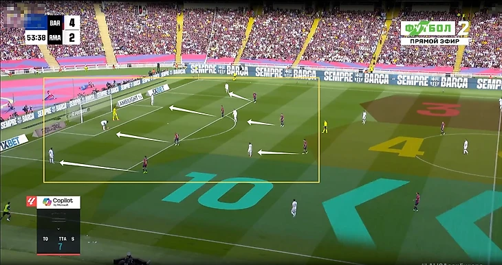 Интенсивное высокое давление – одна из самых важных и характерных черт стиля команды Флика. Против «Реала» хозяева привычно действовали в активной манере без мяча (PPDA = 5.9). Вот пример того, как каталонцы располагались в высоком давлении во втором тайме при преимуществе в счете.