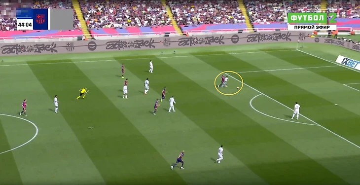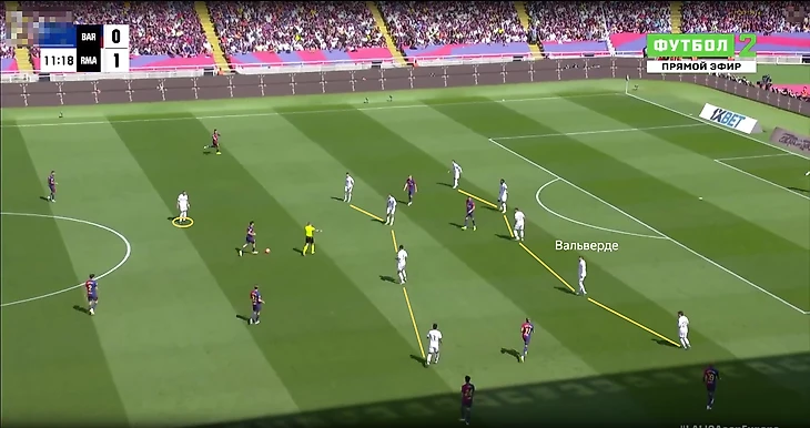 Из-за этого гости зачастую начинали атаки от ворот длинными передачами. Характерно, что регулярно мяч выбивал Феде Вальверде, который обладает сильным ударом. Расчет был на то, что таким образом команда сможет преодолевать прессинг «Барсы» и выигрывать подборы.